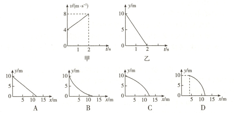 跟踪训练 1:某质点在$Oxy$平面上运动。$t = 0$时,质点位于$y$轴上。它在$x$方向运动的速度—时间图像如图甲所示,它在$y$方向的位移—时间图像如图乙所示。在$Oxy$平面上大致描绘质点在$2s$内的运动轨迹,下面四图中正确的是 (