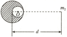 (多选)一个质量均匀分布的球体,半径为 $ 2r $,在其内部挖去一个半径为 $ r $ 的球形空穴,其表面与球面相切,如图所示。已知挖去小球的质量为 $ m $,在球心和空穴中心连线上,距球心 $ d = 6r $ 处有一质量为 $ m_{2} $ 的质点,若被挖去的小球挖去前对 $ m_{2} $ 的万有引力为 $ F_{1} $,剩余部分对 $ m_{2} $ 的万有引力为 $ F_{2} $,则(