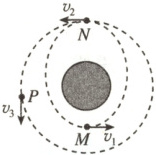 典题1:如图,我国发射“神舟十五号”飞船时,先将飞船发射到一个椭圆轨道上,其近地点$M$距离地面$200\ km$,远地点$N$距离地面$340\ km$。飞船进入该轨道正常运行时,通过$M$、$N$点时的速率分别是$v_{1}$和$v_{2}$。当某次飞船通过$N$点时,地面指挥部发出指令,点燃飞船上的发动机,使飞船在短时间内加速后进入离地面$340\ km$的圆形轨道,开始绕地球做匀速圆周运动,这时飞船的速率为$v_{3}$。比较$v_{1}$、$v_{2}$和$v_{3}$及飞船在正常运行中经过$M$、$N$、$P$三点时的加速度大小,下列结论正确的是 (