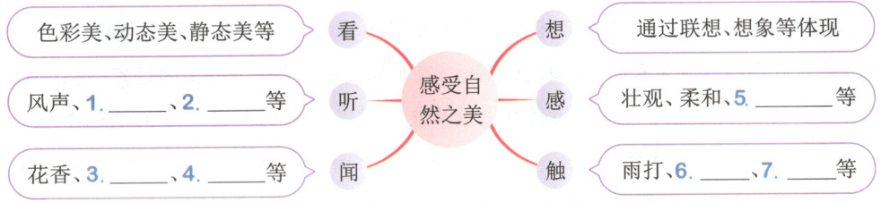 示例:1. 雨声 2. 溪流声 3. 泥土香 4. 绿草香 5. 险峻 6. 风吹 7. 枝条的触碰