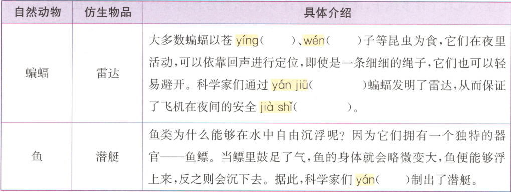 一、兴趣小组制作了仿生资料表,请根据拼音,在括号内写出字词。