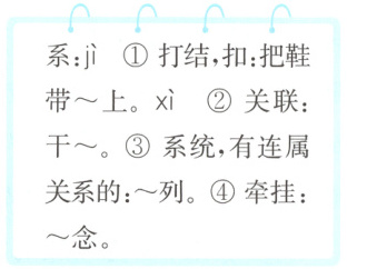 (填序号)。系: $jì$ ① 打结,扣:把鞋带~上。$xì$ ② 关联: 干~。③ 系统,有连属关系的:~列。④ 牵挂: ~念。