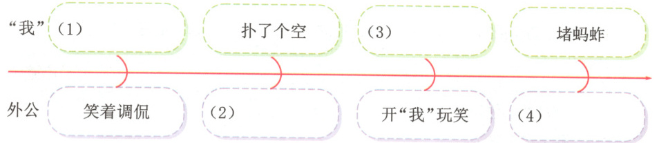 2. 思维导图 读短文第②③④自然段,围绕“捉蚂蚱”写了“我”和外公的表现,请你提炼内容,完成思维导图。(4分)