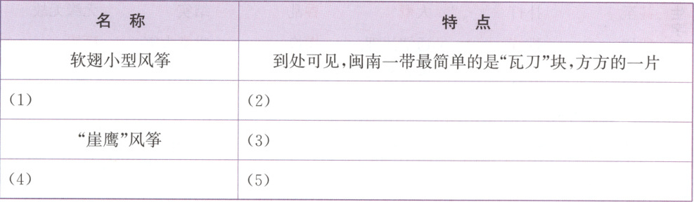 1.(1)“灵芝”风筝 (2)高3米,顶架藤弓,在高空受风时鸣响,声传十余里 (3)可以在一条线上同时放飞3只 (4)“蜈蚣”风筝 (5)独具一格,最长可达300米,腾空后如长蛇飞舞,栩栩如生(每空1分)