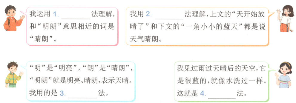 1.D 2.B 3.A 4.C 解析:近义词替换:左边第一个同学通过和“明朗”意思相近的词“晴朗”来理解,这是运用了近义词替换的方法。联系上下文:右边第一个同学借助上文“天开始放晴了”和下文“一角小小的蓝天”这些语境信息来理解“明朗”,属于联系上下文的方法。分解组合:左边第二个同学把“明朗”拆成“明”和“朗”分别解释,再组合起来理解词意,这是分解组合的方法。联系生活实际:右边第二个同学根据自己见过雨过天晴后天空的样子来理解“明朗”,运用的是联系生活实际的方法。