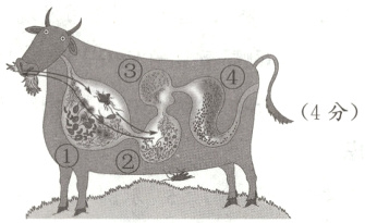 (1) 红头去牛肚子里“旅行”了。①②③④分别是牛的四个胃室,①②③是储存食物的,④是管的。(2分)