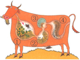① 青头又跳到牛身上,隔着肚皮和红头说话:“红头!不要怕,你会出来的。我听说牛的胃有四个胃室,前三个主要是储存食物的,第四个才是管消化的!”