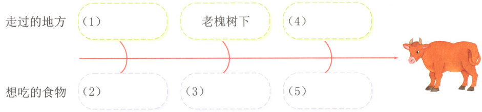 1. 思维导图 读了短文,我知道小黄牛走过了哪些地方,想吃什么食物。我会根据短文内容,填写思维导图。(5分)