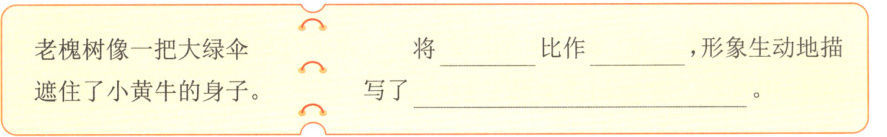 ③ 小黄牛走呀走呀,来到了农田边。它站到了一棵老槐树下,老槐树像一把大绿伞遮住了小黄牛的身子。一阵风吹过,小黄牛的肚子“咕咕”直叫。它饿极了,张开嘴就要啃树皮吃。这时,远处来了几个农民伯伯,正要到老槐树下乘凉。小黄牛想:如果我啃了树皮,树不就死了吗?农民伯伯还怎么乘凉呢?