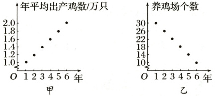 由图乙可知,从第1年到第6年的养鸡场个数也成等差数列,记为$\{b_n\}$,公差为$d_2$,且$b_1=30$,$b_6=10$;从第1年到第6年该县年平均出产鸡的总只数记为数列$\{c_n\}$,则$c_n=a_nb_n$.