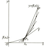 容易发现,平均变化率=$\frac{f(x_0+\Delta x)-f(x_0)}{\Delta x}$表示的是割线P₀P的斜率,当P点沿着曲线无限趋近于P₀点时,割线P₀P无限趋近于一个确定的位置,这个确定的位置的直线P₀T称为曲线y=f(x)在点P₀处的切线,因此函数y=f(x)在x=x₀处的导数f'(x₀)就是切线P₀T 的斜率k₀,即k₀=lim$_{\Delta x \to 0}$$\frac{f(x_0+\Delta x)-f(x_0)}{\Delta x}$=f'(x₀),这就是导数的几何意义.