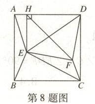 8. 如图,点$E$在正方形$ABCD$的内部,$AD = DE$,以$DE$为斜边的等腰$Rt\triangle DEF$在正方形$ABCD$的内部,$EH\perp AD$,垂足为$H$,连接$BE$,$CF$,$HF$,$AE$,$CE$.下列结论: