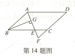 14. 如图,在$□ ABCD$中,$AB = 6$,$AD = 10$,$\angle BAD$的平分线交$BC$于点$E$,交$DC$的延长线于点$F$,$BG\perp AE$,垂足为$G$,$AG = 2.5$,则$\triangle CEF$的周长为