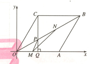 18. (2025 龙东地区)如图,在平面直角坐标系中,菱形$OABC$的边$OA$在$x$轴上,$\tan\angle COA=\sqrt{3}$,$OA$的长是一元二次方程$x^2-3x-18=0$的根,过点$C$作$CQ\perp OA$于点$Q$,交对角线$OB$于点$P$.动点$M$从点$O$以每秒$1$个单位长度的速度沿$OA$向终点$A$运动,动点$N$从点$B$以每秒$\sqrt{3}$个单位长度的速度沿$BO$向终点$O$运动,$M,N$两点同时出发,设运动时间为$t$秒.