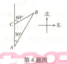 4. 如图,一艘轮船以40海里/时的速度在海面上航行,当它行驶到$A$处时,发现它的北偏东$30^{\circ}$方向有一灯塔$B$. 轮船继续向北航行2小时后到达$C$处,发现灯塔$B$在它的北偏东$60^{\circ}$方向. 若轮船继续向北航行,则轮船离灯塔最近时,还需要(
