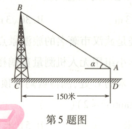 5. 如图,在离铁塔$150$米的$A$处,用测倾仪测得塔顶的仰角为$\alpha$,测倾仪高$AD$为$1.5$米,则铁塔的高$BC$为(