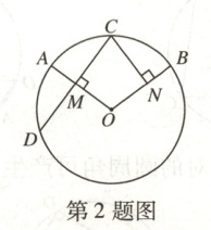 2. 如图,$C$为$\overset{\frown}{AB}$的中点,$CN\perp OB$于$N$,$CD\perp OA$于$M$,交$\odot O$于$D$,$OA = 5cm$,$ON = 3cm$,则$CD$的长为(