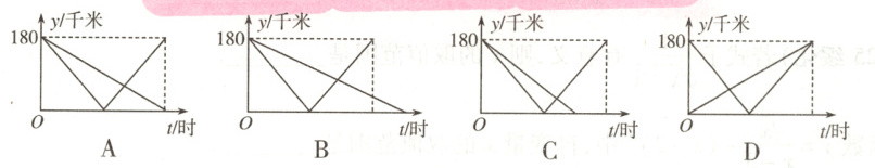 10. 货车和小汽车同时从甲地出发,以各自的速度匀速向乙地行驶,小汽车到达乙地后,立即以相同的速度沿原路返回甲地.已知甲、乙两地相距$180$千米,货车的速度为$60$千米/时,小汽车的速度为$90$千米/时,则下图中能分别反映出货车、小汽车离乙地的距离$y$(千米)与各自行驶时间$t$(时)之间的函数图象是(