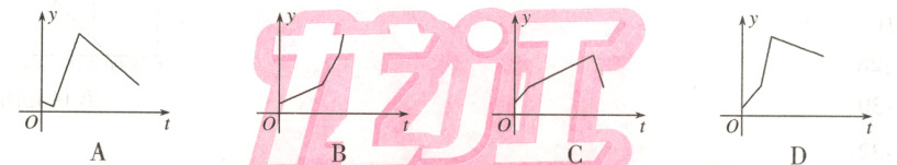 9. 一水池有甲、乙、丙三个水管,其中甲、丙两管为进水管,乙管为出水管.单位时间内,甲管水流量最大,丙管水流量最小.先开甲、乙两管,一段时间后,关闭乙管开丙管,又经过一段时间,关闭甲管开乙管.则能正确反映水池蓄水量$y$(立方米)随时间$t$(小时)变化的图象是(