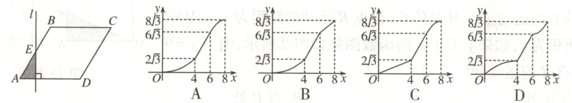 8. (2025齐齐哈尔)如图,在菱形$ABCD$中,$\angle A = 60^{\circ}$,$AB = 4$,动点$E$从点$A$出发沿折线$AB - BC$匀速运动,运动到点$C$时停止,过点$E$作$AD$的垂线$l$,在点$E$运动过程中,垂线$l$扫过菱形$ABCD$(即阴影部分)的面积为$y$,点$E$运动的路程为$x(x > 0)$.下列图象能反映$y$与$x$之间函数关系的是(