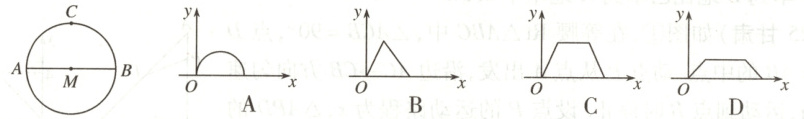 7. 如图,李老师早晨出门锻炼,一段时间内沿$\odot M$的半圆形$M\to A\to C\to B\to M$路径匀速慢跑,那么李老师离出发点$M$的距离与时间$x$之间的函数关系的大致图象是(