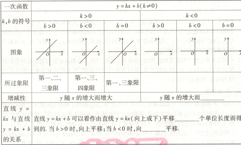 1. 定义:形如$y = kx + b$($k,b$ 是常数,且 $k \neq 0$)的函数叫一次函数;当 $b = 0$ 时,一次函数 $y = kx$也叫正比例函数.