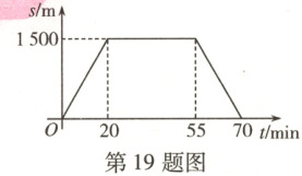 19. 周日,小辉从家步行到图书馆读书,读了一段时间后,小辉立刻按原路回家,在整个过程中,小辉离家的距离 $s(m)$ 与他所用的时间 $t(min)$ 之间的关系如图所示,则小辉从图书馆回家的速度为.
