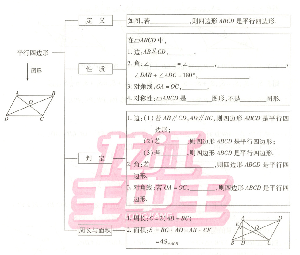 AB//CD且AD//BC;AD//BC;DAB;BCD;∠ABC+∠BCD=180°;OB=OD;中心对称;轴对称;AB=CD且AD=BC;AB//CD且AB=CD;∠DAB=∠BCD且∠ABC=∠ADC;OB=OD