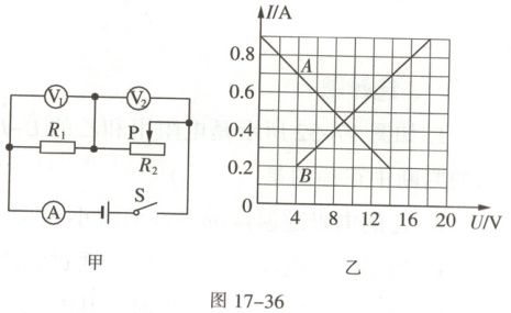 5. (多选)如图17-36甲所示电路,电源电压保持不变,闭合开关$S$,当滑动变阻器的滑片$P$从右端滑到左端的过程中,$R_1$、$R_2$的$I-U$关系图像如图乙所示。则下列判断正确的是 (