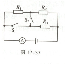 1. 如图17-37所示,电源电压保持不变,电阻$R_1 = 10 \Omega$,$R_2 = R_3 = 20 \Omega$。要使$R_2$、$R_3$并联,$R_1$短路,应闭合开关