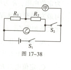 2. 如图17-38所示电路,电源电压不变,$R_1$与$R_2$的阻值之比为$1 : 2$,则当开关$S_1$、$S_2$均闭合,甲、乙均为电压表时,甲、乙两电表示数之比为