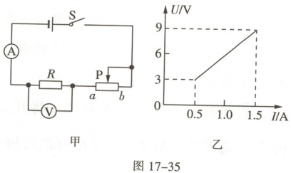 4. (多选)如图17-35甲所示,电源电压保持不变,闭合开关时,滑动变阻器的滑片$P$从$b$端滑到$a$端,电压表示数$U$与电流表示数$I$的变化关系如图乙所示,下列说法正确的是 (