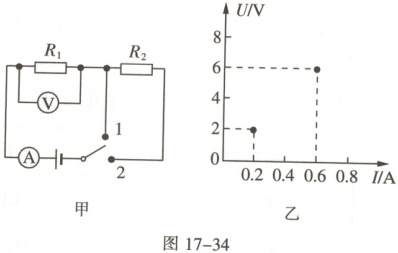 3. (多选)如图17-34甲所示的电路,电源电压保持不变,当开关$S$从$2$转到$1$时,根据电流表和电压表对应的示数在$U-I$坐标系中描绘了相对应的点,如图乙所示。则下列说法正确的是 (