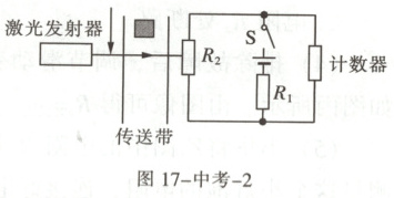 2.C【解析】两电阻串联,计数器(电压表)测$R_2$的电压,已知当有光照射时电阻变小,故激光被遮挡瞬间电阻$R_2$变大,故A错误;由串联电阻的规律,电路的总电阻变大,由欧姆定律可知,电路的电流变小,故B错误;根据$U = IR$,$R_1$的电压变小,由串联电路电压的规律可知,电压表示数变大,计数器两端的电压变大,故C正确;根据串联电路各处的电流相等,故$R_1$与$R_2$的电流之比为$1:1$,保持不变,故D错误。