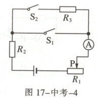 所示,电源电压$15\ V$保持不变,滑动变阻器的滑片$P$在最右端。闭合开关$S_1$,断开开关$S_2$,滑片$P$移至中点附近时,电流表的示数是$0.5\ A$;保持滑片$P$不动,闭合开关$S_2$,断开开关$S_1$时,电流表的示数是$0.2\ A$,则电阻$R_3$的阻值是(