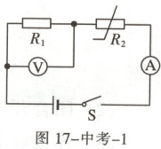 1.D【解析】由题中电路图可知,热敏电阻与定值电阻串联,电压表测量定值电阻$R_1$两端的电压,电流表测量电路电流;当温度升高时,热敏电阻的阻值减小,因此电路中的总电阻减小;已知电源电压不变,由$I = \frac{U}{R}$知,电路中的电流变大,即电流表示数变大,故AB错误。根据$U = IR$知,在电阻不变时,定值电阻$R_1$两端的电压变大,电压表的示数增大,故C错误,D正确。