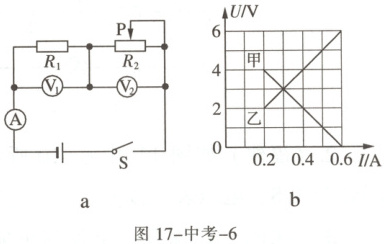 6. (桂林)如图中的图a所示电路,电源电压保持不变,当闭合开关$S$,调节滑动变阻器阻值从最大变化到最小,两个电阻的“$U-I$”关系图像如图b所示,则下列判断正确的是(