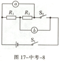 8. (天津)(多选)如图所示的电路中电源电压不变,$a$、$b$为同种电表(电流表或电压表)。闭合$S_1$和$S_2$,$a$、$b$两表示数分别为$3$和$1$(单位为$A$或$V$);将$a$、$b$换为另一种电表,闭合$S_1$、断开$S_2$,$a$表示数为$0.4$(单位为$A$或$V$)。则(