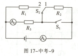 1.$1:1$ $2:1$【解析】开关$S_1$断开、开关$S_2$掷到$1$,$R_2$和$R_3$串联,串联电路电流处处相等,所以电流表$A_1$与电流表$A_2$的示数之比为$1:1$;当开关$S_1$闭合、开关$S_2$掷到$2$时,$R_1$与$R_3$并联,$A_1$测干路电流,$A_2$测$R_3$的电流,三个电阻$R_1$、$R_2$、$R_3$的阻值均相同,所以电流表$A_1$与电流表$A_2$的示数之比$2:1$。