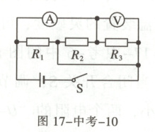 2.$3$ $0.6$【解析】闭合开关$S$,三个电阻并联,电压表测电源电压,故电压表示数为$3\ V$;电流表测$R_2$、$R_3$并联的总电流,$R_2$、$R_3$阻值均为$10\ \Omega$,故两电阻并联的电阻为$R_{23}=\frac{10\ \Omega}{2}=5\ \Omega$,由欧姆定律,得电流表的示数:$I=\frac{U}{R_{23}}=\frac{3\ V}{5\ \Omega}=0.6\ A$。
