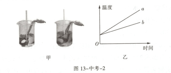 3. (湖北)如图13-中考-2甲,利用相同规格的加热器加热等质量的$a$、$b$两种液体,得到温度随时间变化的图像如图13-中考-2乙,分析可知(