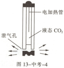 5. (山西)二氧化碳($CO_{2}$)爆破技术是现代工程建设中非常环保的技术,起爆前高压泵将$CO_{2}$压缩成高压气体,液化后输入爆破筒内。如图13-中考-4所示,爆破时电加热管发热,使筒内的液态$CO_{2}$迅速汽化,形成的高压气体从泄气孔中喷出,实施爆破。下列说法正确的是(
