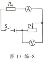 1. 如图17-综-8所示电路中,闭合开关$S$,移动滑动变阻器的滑片$P$,当电压表的示数为$6\ V$时,电流表示数为$0.5\ A$;当电压表的示数为$7.2\ V$时,电流表示数为$0.3\ A$,则电阻$R_0$为