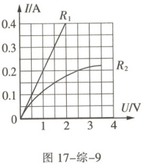 2. 电阻$R_1$与$R_2$的$I-U$图像如图17-综-9所示。当$R_2$上的电压为$2.5\ V$时,$R_2$的阻值是