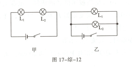 5. 如图17-综-12所示,将灯$L_1$、$L_2$按甲、乙两种方式接在电压相同的两个电路中,甲图中灯$L_1$、$L_2$两端的电压分别为$2\ V$和$3\ V$,则$L_1$、$L_2$两灯灯丝电阻之比为
