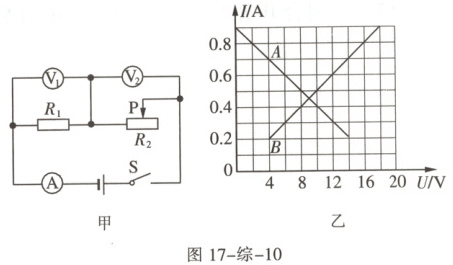 3. 科学思维 如图17-综-10甲所示电路,电源电压保持不变。闭合开关$S$,当滑动变阻器的滑片$P$从右端滑到左端的过程中,$R_1$、$R_2$的$I-U$关系图像如图乙所示。