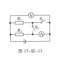 6. 如图17-综-13所示的电路中,电源电压恒定不变,已知$R_1=3R_2$,当$S_1$闭合,$S_2$断开时,电压表示数为$3\ V$,电流表示数为$0.4\ A$,电源电压为