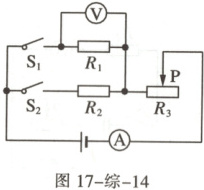 1. 如图17-综-14所示电路,电源电压保持不变,已知定值电阻$R_2$的阻值为$10\ \Omega$,滑动变阻器$R_3$上标有“$30\ \Omega\ \ \ 1\ A$”字样。当滑动变阻器$R_3$的滑片$P$调到最左端,闭合开关$S_1$、$S_2$时,电压表的示数为$3\ V$,电流表的示数为$0.5\ A$。求: