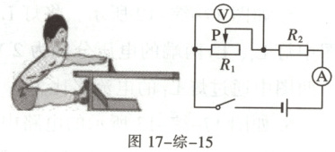 2. 跨学科实践 如图17-综-15所示是某物理兴趣小组设计的简易坐位体前屈测试仪的测试示意图、简化原理图。在测试中,测试的同学向前推动测试仪的滑块实际上是移动滑动变阻器的滑片,电压表的示数用来反映被测试者的成绩。电源电压恒为$6\ V$,电压表量程为$0\sim3\ V$,电流表量程为$0\sim0.6\ A$,滑动变阻器$R_1$标有“$15\ \Omega\ \ \ 1\ A$”,滑片$P$每移动$1\ cm$,$R_1$的电阻变化$0.5\ \Omega$,定值电阻$R_2=20\ \Omega$。求: