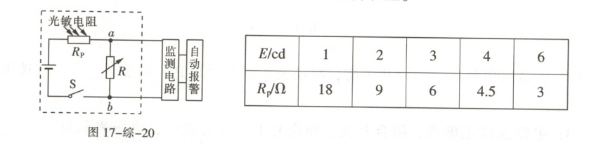 同学们想设计一个火灾自动报警装置,于是在网上购买了一个红外光敏电阻。已知光敏电阻的阻值与红外线强度变化的对应关系如下表所示($E$为红外线强度,$cd$表示其单位)。设计的电路图如图17-综-20所示,$R$是电阻箱,$R_P$是光敏电阻,电源电压恒为$9\ V$,且当$a$、$b$两点间的电压等于或大于$6\ V$时,就会触发自动报警装置。